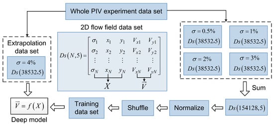 Experiment dataset format and data pre-processing procedure of the training dataset. Note: the whole PIV dataset is divided into two parts: training dataset ( = 0.5%–3%); extrapolation dataset ( = 4%).