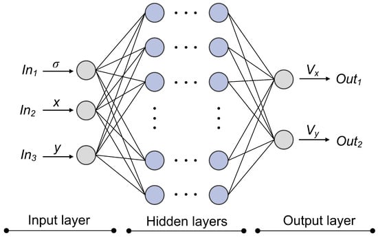 Figure 5 shows the architecture of the multilayer neural network established in the present work. The input layer consists of three neurons, corresponding to the total air pressure drop , x coordinates, and y coordinates. The output layer includes two neurons, which indicate the axial velocity and the radial velocity . The hidden layers are a fully connected multilayer structure with eight neurons in each hidden layer. The number of neurons is chosen based on the balance between the accuracy and the training time. The effect of the number of neurons on prediction accuracy is detailed in the Supplementary Materials. All neurons in the hidden layers are independent of each other. The number of hidden layers is selected according to the comparison of prediction accuracy and training time, as discussed in Section 3.1.