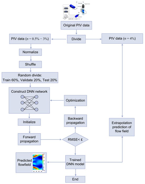 The present study applies optimization algorithms to train the deep learning model from the dataset. The training and prediction process of the DNN model is sketched in Figure 6. Original PIV data are first divided into two groups: input dataset and extrapolation dataset. The input dataset is normalized, shuffled, and further divided randomly into three groups: the training sets (60%) for DNN fitting, the validation sets (20%) for hyper-parameter optimization, and the test sets (20%) for evaluating the generalization ability of untrained data. The above division ratio of the input dataset has been optimized by considering both prediction accuracy and training time, as detailed in the Supplementary Materials. The data are propagated forward through the DNN network to obtain the weight and bias of each neuron. Back-propagation of the data and hyper-parameter optimization continue until the prediction accuracy of the DNN model meets the goal. The fully trained DNN model is capable of performing reconstruction and extrapolation prediction of flow fields.