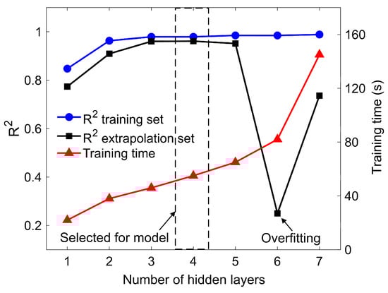 Figure 7 shows the of the training set and the extrapolation set as a function of the number of hidden layers. The of the training set is seen to increase with the number of hidden layers. The increase in diminishes when the number of hidden layers exceeds three. For the extrapolation set, however, when the number of hidden layers exceeds four, decreases. This phenomenon is called over-fitting in the area of machine learning and needs to be avoided. Figure 7 also presents the neural network training time for different numbers of hidden layers. The related algorithm is implemented using MATLAB 2022b, running on a personal computer with an 11th Gen Intel(R) Core(TM) i7-11800H @ 2.30 GHz. It is seen that the training time of the model increases with the number of hidden layers.