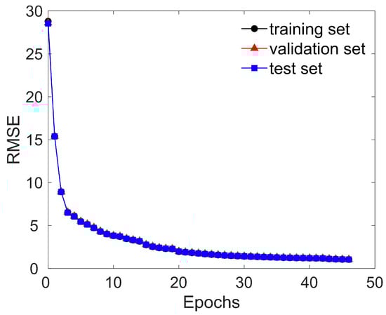 We train the DNN model using the Levenberg–Marquardt method. The model demonstrates excellent predictive performance during the training process, as shown in Figure 8. After 40 epochs, the DNN model reaches good prediction ability. The prediction RMSE of the training set, validation set, and test set is less than 1.05. There is no significant gap between the RMSE of the three datasets, indicating that the trained model achieves good prediction accuracy and generalizes well in the untrained flow field data from new operating conditions. Based on the discussion above, the complex multi-swirling flow fields are predicted and extrapolated via the optimized neuron network.