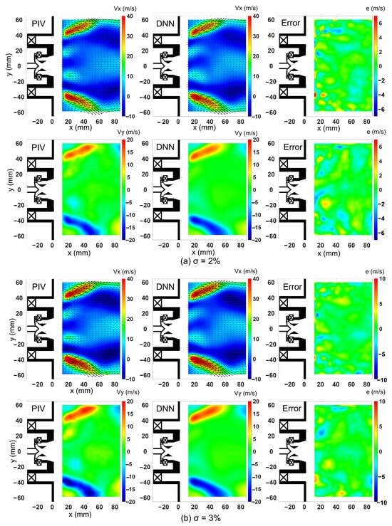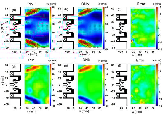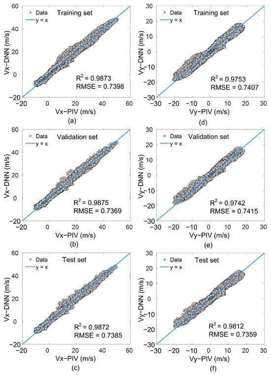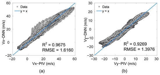 where the quantities and represent the velocity of the PIV test and the DNN prediction, respectively, and n is the sampling points of the velocity fields. It is seen from Equation (5) that a value close to 1 means a better prediction ability of the model.
