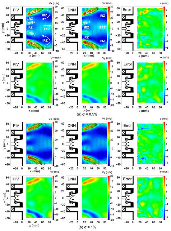 We examine the prediction fidelity of the detailed flow field topologies at an air pressure drop of 0.5% and 1%, as shown in Figure 10. The error of velocity component e is calculated by the difference between the PIV test and the DNN prediction. The flow field features a separated dual swirl structure, consisting of two high-speed swirling jets (SWJ) entering from the inner pilot swirlers and the outer main swirler. A lip recirculation zone (LRZ) is formed near the lip between the inner and outer swirlers, which separates the inner and outer swirling jets. Inner recirculation zones (IRZ) characterized with negative axial velocities are found inside the swirling jets, generated by the negative pressure gradient. An exit positive velocity zone (EPZ) is observed at the center of the combustor outlet. It is seen from Figure 10 that the above complex flow regions have been successfully learned and captured by the deep learning model. The velocity field and vectors reconstructed by the trained neural network meet well with the flow field obtained from PIV experiments under the air pressure drops of 0.5% and 1%.