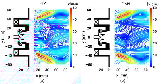 Streamline plot of the velocity field from (a) PIV experiment and (b) DNN prediction ( = 0.04).