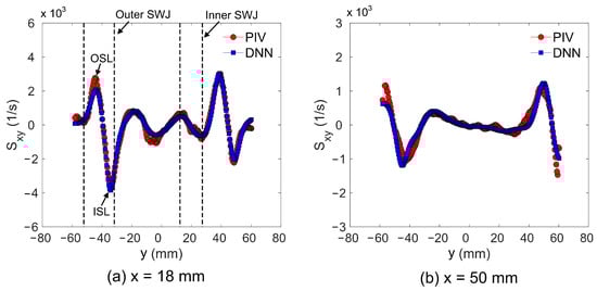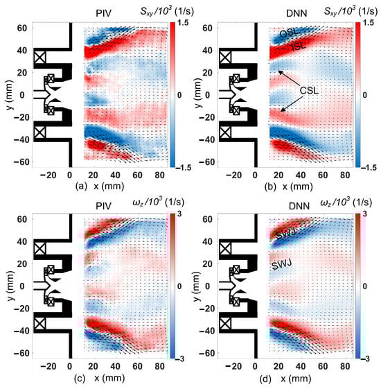 Figure 15c,d display the comparison of the 2D distribution of vorticity between the PIV data and the DNN prediction. As expected, the 2D vorticity field is similar to the distribution of the strain rate, indicating that the viscous fluid shear leads to the rotation of fluid elements and mutual shear deformation at the same time. Positive and negative vorticity represents the counterclockwise and clockwise orientation of flow vortex rotations. The outer SWJ is found with high vorticities of more than 3000 s−1, which also corresponds to the ISL and OSL shown in Figure 15b. These regions of peak vorticities illustrate that the intense mixing and vortex rotations occur between the SWJ and recirculating flow.