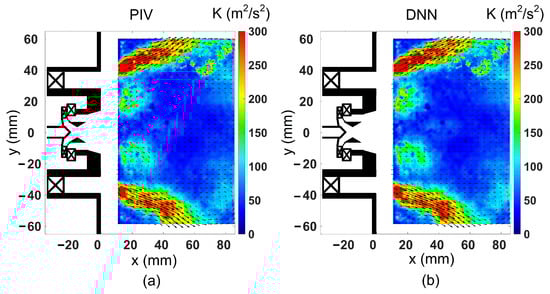 Contours of turbulent kinetic energy K in the x–y plane from the (a) PIV experiment and (b) DNN prediction. The condition is = 3%.