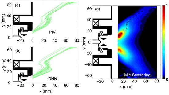 Comparison of fuel droplet trajectory and spray dispersion ( = 3%). (a) Fuel droplet trajectory calculation based on air velocity predicted by DNN. (b) Fuel droplet trajectory calculation based on air velocity from PIV. (c) Time-averaged spray distribution from Mie scattering experiments.