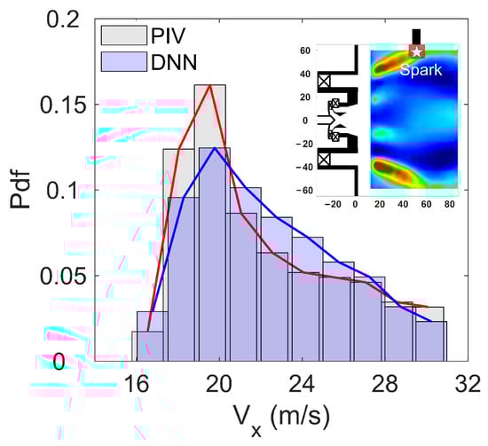 Swirl spray flames in aero-engine combustors are ignited by multiple sparks at the liner wall. The flow velocity at the vicinity of the ignition plug is important for the early ignition phase, i.e., flame kernel generation. Figure 19 shows the histogram and probability density function (PDF) of velocities at the ignition region with an air pressure drop of 3%. It is found that the statistical velocity distribution of DNN prediction is similar to that of the PIV test with a peak PDF velocity of 19 m/s. The deep learning model provides reliable guidance for evaluating the ignition performance at the preliminary stage of combustor design.