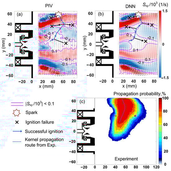Figure 15a,b present the strain rate distribution in the x–y plane calculated from PIV data and DNN prediction, respectively. The shear strain rate, also known as the angular deformation rate, represents the amount of angular deformation per unit time of fluid elements. High values of strain rates (up to 1500 s−1) are seen at the interfaces between the outer swirling jet flow and the surrounding recirculation flow. Two opposite orientations of fluid angular deformation are reflected in the positive and negative values of strain rate. For the high strain rate zone at the outlet of the outer swirling channel, the negative values indicate the OSL while the positive values correspond to the ISL. Moderate values of strain rate are also observed between the inner swirling flow and the recirculation zone, which are representative of CSL.