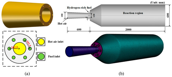 In the present study, the injection process of hot air and hydrogen-rich gas was simulated with ANSYS-FLUENT. The tuyere structure, designed for a 3200 m3 commercial blast furnace, is shown in Figure 1a. The tuyere had a tapered design, with an inlet diameter of 180 mm and an outlet diameter of 130 mm. Ring nozzles, each with a diameter of 16 mm, were evenly distributed around the core. The geometry and meshes of the tuyere, ring nozzle, and reaction region are presented in Figure 1b, while the operating parameters used in the simulations are presented in Table 1. The accessory foramina around the front of the tuyere were used to inject hydrogen-rich gas, with its composition detailed in Table 2. The outlet pressure of the reaction region was set to 0.3 MPa. The entire calculation domain was divided using polyhedral mesh. Spatial discretization was performed using a cell-based least-squares approach, and the SIMPLE method was employed to solve the coupled pressure-velocity problem. To ensure the accuracy of the simulation results, a second-order upwind scheme was used. When the residual value of the energy and radiation is smaller than 10−6, and the value of other variables is smaller than 10−3, the solution is considered to converge.