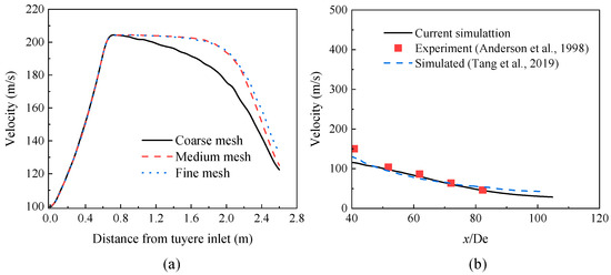Figure 2. Comparisons of velocities along the tuyere axial direction (a) for different grid configurations and (b) between the present study and other relevant research [17,19].