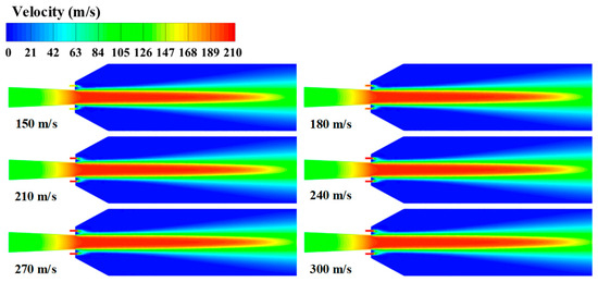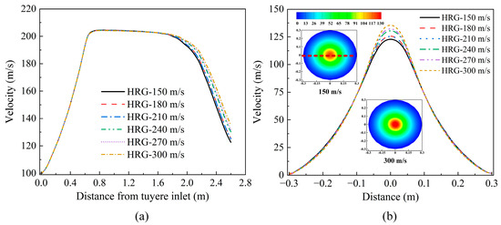 During the blast process in the tuyere of a blast furnace, the hot air was obstructed by the surrounding gas and coke particles, leading to a gradual reduction in blast velocity. The coherent injection of hydrogen-rich fuel around the tuyere mitigated the decay of the main jet velocity, the combustion of hydrogen-rich fuel from the ring nozzle outlet around the tuyere generated a high-temperature, low-density flame. To examine the effect of shrouding flame on the blast morphology, Figure 3 presents the velocity distribution within the reaction region at various shrouding gas velocities. As depicted in the figure, the velocity of the hot air entering the tuyere gradually increased, reaching its peak after merging with the shrouding gas. The shrouding gas strands entrained the surrounding gases, and the amount of entrained gas gradually increased along the length of the jet, causing the jet to spread gradually outward until it influenced the jet’s center. Higher shrouding gas velocities resulted in a longer core region of the jet. This observation aligned with findings reported by Feng et al. in their study on a coherent jet [13].