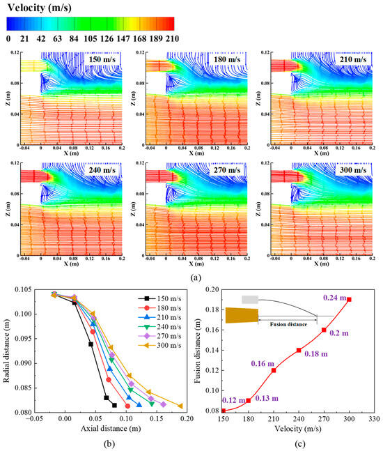 Figure 5. (a) Streamlines pattern; (b) co-flow offset distance; and (c) fusion distance for different fuel jet velocities.