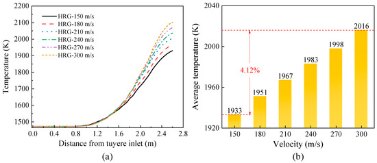 Figure 7. (a) The Comparison of temperature along the tuyere central line at different fuel jet velocities and (b) the average velocity of the reaction region at different fuel jet velocities.