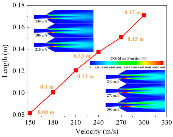 Figure 8. The length of high CO2 concentration region at different fuel jet velocities.