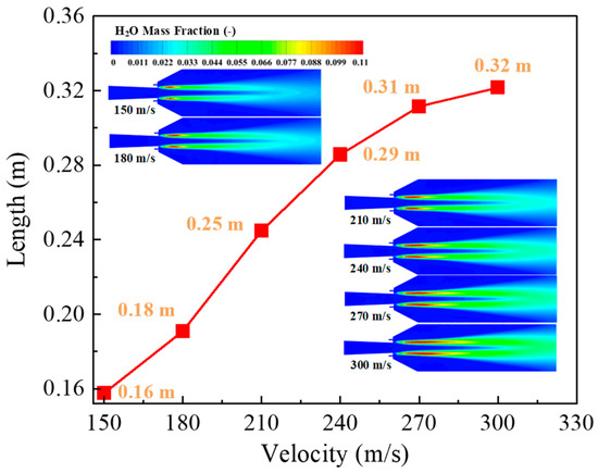 Figure 9. The length of high H2O concentration region at different fuel jet velocities.