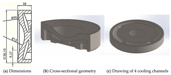 (a) Dimensions of the designed optical lens, (b) cross-sectional geometry of a metal optical lens (which contains a cooling channel), (c) Drawing of 4 cooling channels, designed using the SolidWorks (2018) software program.