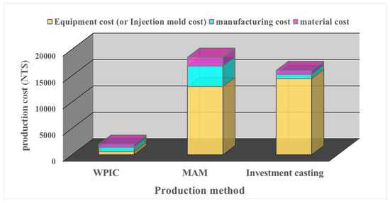 Figure 7 displays the manufacturing costs of WPIC, MAM, and investment casting. The detailed cost distribution of the three processes is shown in Table 2. The results revealed that the total production costs of MAM and investment casting were nine and eight times higher, respectively than those of WPIC. First, equipment cost accounted for approximately 70% of the total production cost of MAM, and wax model manufacturing accounted for approximately 87% of the total production cost of investment casting. Next, according to the cost list in Table 2, MAM has the highest cost because it requires the use of metal printing equipment, wire electric discharge machines, and powder costs. The cost of investment casting is only slightly lower than that of MAM because it requires higher design and manufacturing costs of molds and mold cores. Therefore, higher manufacturing efficiency and lower manufacturing cost can be achieved through WPIC than through MAM or investment casting.