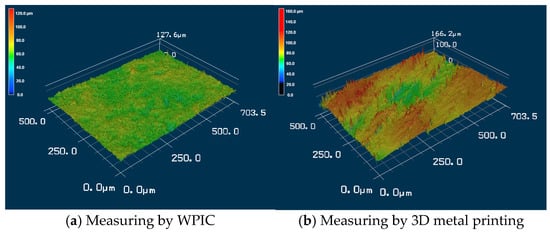 Metal optical lenses with low surface roughness can achieve excellent specular reflectivity in optical systems, and using a lens production method that ensures low surface roughness can considerably reduce post-machining costs. The surface roughness of the fabricated metal lenses was evaluated using an LCM. Figure 9 displays the surface roughness of lenses produced through WPIC and MAM. The results indicated that the lenses produced through WPIC had 45% lower surface roughness than those produced through MAM. The cavity of the gypsum mold used in WPIC has low surface roughness; therefore, the metal solution’s surface experiences a relatively uniform tensile force in the casting process, which results in a smooth lens surface. In MAM, a high-temperature laser system is used to melt metal powder, which then fuses into a component; thus, a metal lens with a relatively rough surface is produced in MAM. Figure 10a,b display partial surface profiles of metal lenses manufactured through WPIC and MAM. These figures indicate that a smoother lens surface was produced in WPIC than in MAM.