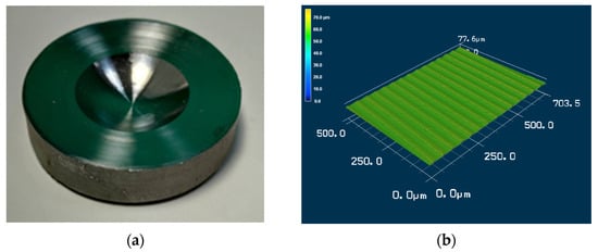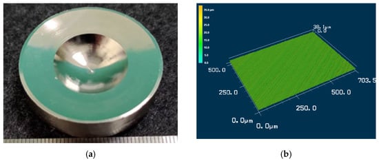 Image and surface profile of a metal optical lens that was produced through WPIC and then subjected to CNC machining. (a) Surface of a metal optical lens produced through WPIC and then subjected to CNC machining; (b) Surface profile obtained for the lens in (a) by using a laser confocal microscope (LCM).