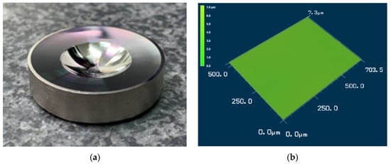 Image and surface profile of a metal optical lens produced through WPIC and then subjected to CNC machining and ENP in sequence. (a) Mirror-like surface of a metal optical lens produced through WPIC and then subjected to CNC machining and ENP in sequence; (b) Surface profile obtained for the lens in (a) by using an LCM.