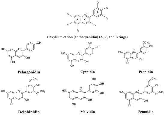 Over 30 individual anthocyanidins have been identified, with 90% of them consisting of pelargonidin, cyanidin, peonidin, delphinidin, petunidin, and malvidin, and been used to distinguish fruits based on the predominant type of anthocyanidins. These six anthocyanidins exhibit variations in the number of hydroxyl and methoxy groups present in the B ring of the flavylium cation (Arruda et al. [6] and Figure 2). Flavylium cations, also referred to as anthocyanidins, typically have either five (3, 5, 7, 3′, and 4′) or six (3, 5, 7, 3′, 4′, and 5′) substituents (Figure 2) [16]. Anthocyanin pigments are derived from anthocyanidin by adding sugar molecules, which can be acylated with different acyl groups, leading to diverse types of anthocyanins, which serve various functions, such as providing a defence mechanism against environmental stress factors, including pathogens, herbivores, drought, extreme temperatures, and ultraviolet radiation [25,26,27]. This has formed the basis for the use of anthocyanin compounds in various functional foods. The different types of anthocyanins can be used to classify fruits, depending on the other types of chemical groups attached to the anthocyanin; for instance, aglycones can be used to classify fruits into the pelargonidin group, the cyanidin/peonidin group, and multiple of the most common anthocyanidin groups [28].