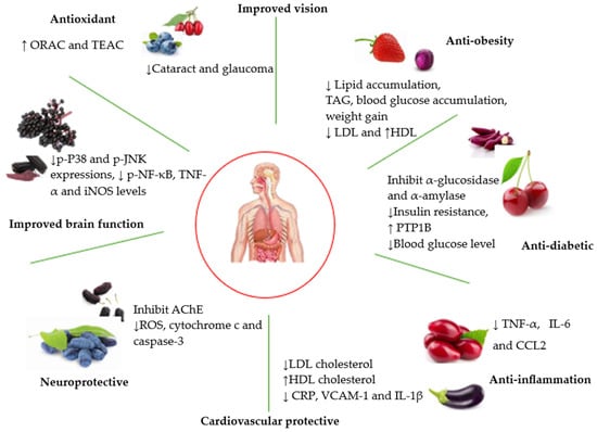 Summary of the mechanisms and health benefits of anthocyanins from different plant sources. ORAC = oxygen radical absorbance capacity; TEAC = Trolox equivalent antioxidant capacity; LDL = low-density lipoprotein; HDL = high-density lipoprotein; TNF-α = tumour necrosis factor; IL-6 = interleukin 6 receptor; CCL2 = chemokine ligand 2; AChE= acetylcholinesterase; ROS = reactive oxygen species; p-NF-κB = nuclear factor kappa B; iNOS= inducible nitric oxide synthase; p-P38 = mitogen-activated protein kinase; p-JNK = un N-terminal kinase; TAG = triacylglycerol; PTP1B = protein tyrosine phosphatase 1B; CRP = C-reactive protein; VCAM-1 = vascular cell adhesion molecule-1, IL-1β = interleukin-1 beta.