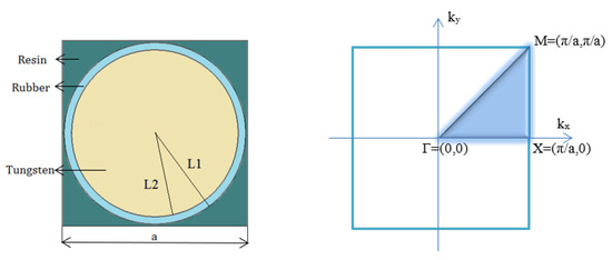 A two-dimensional, three-component, three-parameter local resonance phononic crystal, featuring inclusions composed of soft silicone rubber and hard tungsten embedded in a resin substrate, was investigated using the finite element method-perfectly matched layer (FEM-PML). The unit cell diagram is presented in Figure 3. The unit cell dimensions are as follows: a = 0.1 m. The substrate is made of epoxy resin, while tungsten, with a radius of 0.046 m, serves as the scatterer. A silicone gel layer, with a thickness of 0.002 m, is applied between the scatterer and the substrate. Material properties, including density and Lame constants, influence the band gap frequency and overall vibration characteristics of phononic crystals. Variations in density directly impact the band gap frequency of the phononic crystal and the attenuation effect of vibrations within the band gap frequency range. Typically, an increase in material density shifts the first band gap towards lower frequencies, effectively modulating the band gap frequency range of phononic crystals. In finite-layered multi-periodic structures, vibrations are significantly attenuated within the band gap frequency range, contributing to vibration damping. Changes in density may influence this attenuation effect, subsequently altering the overall vibration characteristics of the phononic crystal. Lame constants play a crucial role in determining the existence and size of the band gap. Large differences in Lame constants favor the formation of a complete band gap. An increase in the elastic modulus generally shifts the first gap towards higher frequencies. Additionally, variations in the elastic constant also affect the width of the band gap, modifying the phononic crystal’s ability to control elastic waves within a specific frequency range. The material density and Lame constants of the models are listed in Table 1.