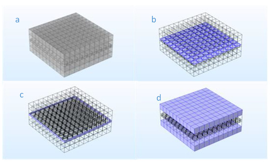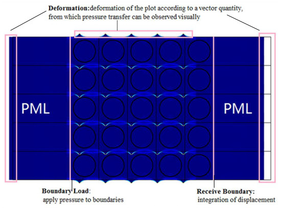 As shown in Figure 2, the periodic plates are comprised of 5 × 5 periodic cells. In order to prevent reflections, two perfectly matched layers (PMLs), each with a length equivalent to twice the lattice constant (2a), are implemented in the X-direction. Meanwhile, periodic boundaries are employed in the Y-direction. A deformation node is set up to distort the plot based on a vector quantity, allowing for the visual observation of pressure transfer.