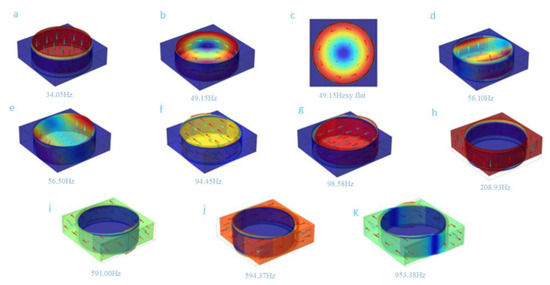 Modal diagram: (a) 34.05 Hz, (b) 49.15 Hz, (c) 49.15 Hzxy flat, (d) 56.10 Hz, (e) 56.50 Hz, (f) 94.45 Hz, (g) 98.58 Hz, (h) 208.93 Hz, (i) 591.00 Hz, (j) 594.37 Hz, (k) 953.38 Hz.