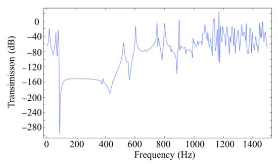 To illustrate the influence of different excitation source directions on the calculation of the transmission loss of the phononic crystal plate, this paper first calculates the transmission loss of the phononic crystal plate in the conventional XY-direction and obtains Figure 7.