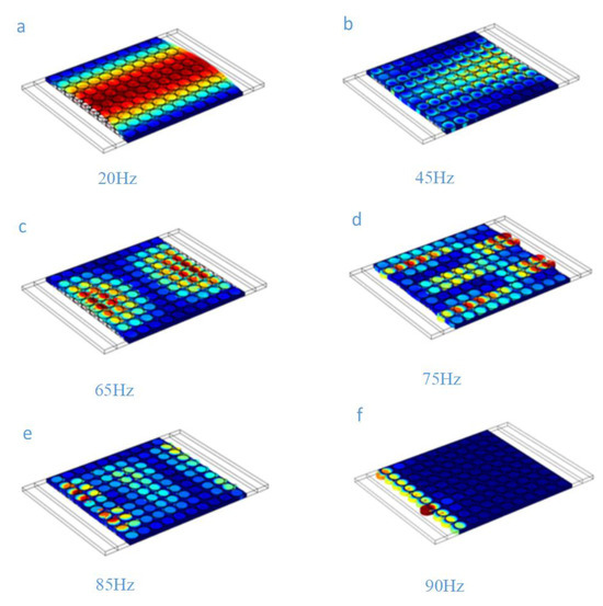 XY-direction excitation vibration displacement map: (a) 20 Hz; (b) 45 Hz; (c) 65 Hz; (d) 75 Hz; (e) 85 Hz; (f) 90 Hz.