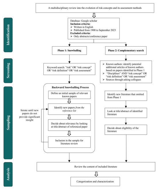The objective of this study is not to provide a thorough review to cover all risk concepts and its assessment methods. It is unrealistic to cover all relevant studies for such a broad topic. The primary aim is to establish the perspectives and methods of major disciplines in addressing risks. Snowballing is a literature review method that identify additional papers from reference list or citations []. We utilized a structured approach that integrates a backward snowballing literature review (from the reference lists) approach, complementary database search, and personal knowledge in this study. The detailed flowchart of snowballing literature review process is shown in Figure 1.