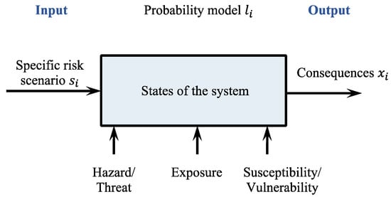 The quantitative definition developed by Kaplan and Garrick profoundly influences how risk is conceptualized, especially in engineering settings []. Engineers and scientists prefer quantitative approaches that focus on “operationalization” and “measurement”. From the engineering and science point of view, risk can be interpreted from a systems-based perspective as a function of system states []. They believe that risk could be defined and measured mathematically and free from subject bias. Different from the economics system, engineering risk assessment is often associated with systems where data is insufficient or absent. Actuarial approaches are inappropriate for engineers. Risk calculations in engineering have to handle various uncertainties. Hence, experts have to judge the probabilities based on their experience and knowledge. The illustration of system-based definitions is shown in Figure 3.