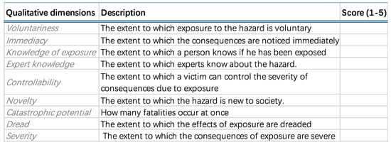 The psychometric approach has been continuously expanded to include more perception factors. Bassarak et al. proposed that disputed risk and morality should be captured as additional dimensions of risk judgments in addition to dread and novelty []. Psychometric risk paradigm is widely used in various fields to study different group’s perceptions of specific risks []. Psychometric risk studies usually use questionnaire surveys to rate possible hazards on various scales, e.g., voluntariness of risk (1 = voluntary, 5 = involuntary). Figure 6 shows an example of a psychometric risk questionnaire.