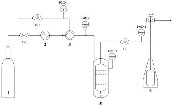 Schematic representation of SFE equipment: (1) CO2 tank, (2) cooler, (3) high-pressure pump, (4) extractor tank, (5) extractor jacket, and (6) collecting tank. V: valve; PMD: pressure measurement device; TMD: temperature measurement device.