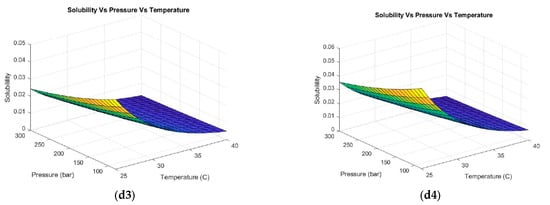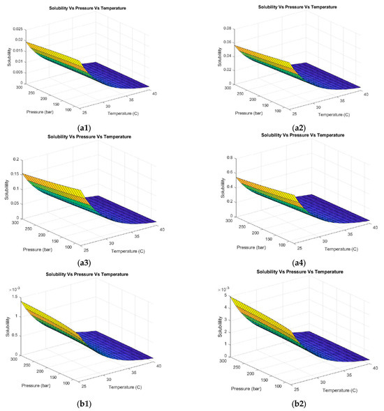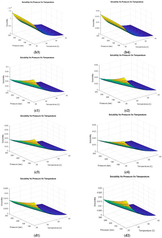 Using hexane as a co-solvent (Figure 4(b1–b4)) evidences the same trend of pressure and temperature behavior described above. Nevertheless, the representative numerical values of solubility decreased drastically compared to the case of using CO2 as the exclusive solvent. This was expected because of the characteristics of hexane (see Table 3). Hexane is a nonpolar solvent. When used as a co-solvent in a supercritical CO2 system, the effective polarity of the supercritical fluid is further decreased, resulting in negative implications when extracting polar compounds such as hesperidin [64]. As a result, the use of hexane as a co-solvent is not recommended because this compound does not optimize the operating conditions compared to more polar co-solvents.