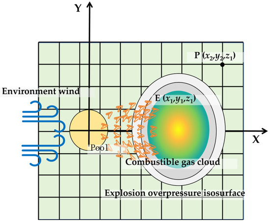 In this research, the gas concentration in three-dimensional space is calculated by the SLAB model, and the combustible cloud diffusion is obtained by taking into account the reaction limit of the evaporated gas. Concentrations below the LFL are considered non-reactive during the propagation of the reaction. In contrast, concentrations above the upper flammability limit are assumed to mix with fresh air under the influence of the shock wave and actively participate in the reaction. Therefore, the combustible gas cloud is defined as having a concentration higher than the LFL. Figure 1 is the diffusion and explosion schematic diagram of the evaporated gas cloud from the liquid pool.