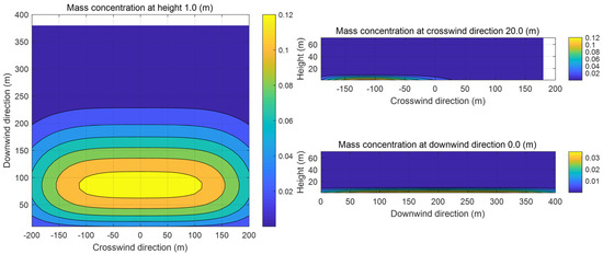 Figure 2 illustrates the mass concentrations of propane in the xy, xz, and yz planes at 100 s. As can be seen in Figure 2, under the influence of the ambient wind, the contour lines of the propane mass concentration are approximately ellipsoidal, which is consistent with the contour lines of the cloud in the transient state given in the SLAB manual. The center of the cloud is near 50 m downwind, and since the relative molecular mass of propane gas is 1.52, the uplift of propane vapor is not obvious at 10 s, and the concentration of the gas is close to 0 kg/m3 at a height of more than 10 m. Because of the density variability of the gas cloud in the crosswind direction, the air entrainment under the ambient wind is more obvious, and the major axis of the ellipse in the xy plane is the x-axis.