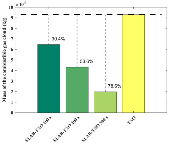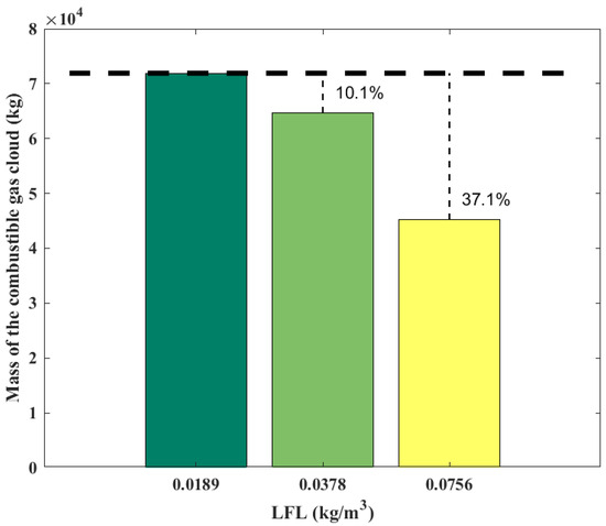 Figure 9 shows the variation of the gas cloud mass with the LFL. The mass of the gas cloud is 7.19 × 104 kg at the LFL of 0.0189 kg/m3, and it decreases by 10.1% to 6.46 × 104 kg when the LFL is doubled to 0.0378 kg/m3, and it decreases by 37.1% to 4.52 × 104 kg when the LFL is further doubled to 0.0756 kg/m3. Increasing the LFL can significantly reduce the combustible gas cloud mass.