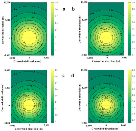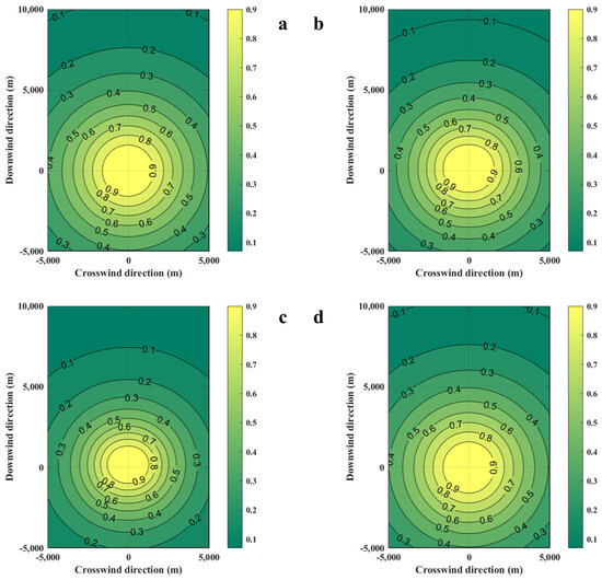 Diffusion diagrams of casualty probabilities obtained from the SLAB-TNO model at various wind speeds. (a) Wind speed is 0.5 m/s, (b) Wind speed is 1.0 m/s, (c) Wind speed is 2.0 m/s, (d) Wind speed is 3.0 m/s.