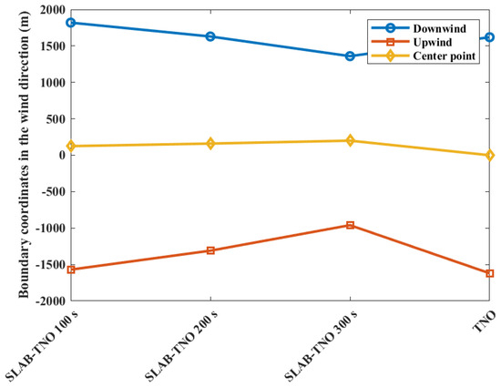 The contour coordinates with a casualty probability of 0.9 at various diffusion times are shown in Figure 5 when the casualty probability is 0.9. It can be seen that with the increase in diffusion time, the area of casualty probability decreases. At 100 s, the area of casualty probability is at −1570 m upstream and 1820 m downstream distances of the leak point. At 200 s, the area is at −1310 m upstream and 1630 m downstream distances of the leak point. At 300 s, the area is at −960 m upstream and 1360 m downstream distances of the leak point, respectively. Since the ambient wind intensifies the mixing of evaporated gases with air, and as time increases, the concentration of more premixed gases decreases below the flammability limit. The area of casualty probability obtained from the TNO model is at −1620 m upstream and 1620 m downstream distances of the leak point. At the same time, the center point of the gas cloud moves downstream by the ambient wind, which leads to the downstream movement of the explosion center point. From 100 s to 300 s, the explosion center moves from 125 m downstream to 200 m, which is more different from the leakage center point. As a result of the movement of the explosion center point, the area of casualty probability downwind of 0.9 at 100 s is larger than the area obtained from the TNO model. This phenomenon can be explained by the movement of the combustible gas cloud mass, which counteracts the reduction in explosion intensity at the target point caused by the diminishing mass of the gas cloud. As a result, there is an increased risk at the downstream target point.