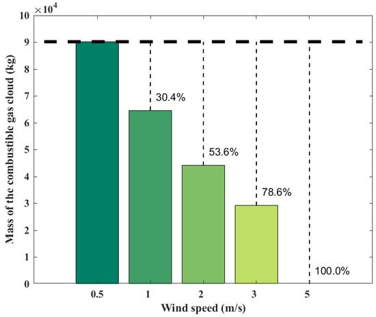 Wind speed has a significant effect on the diffusion of the combustible gas cloud; the ambient wind may promote the spread of the combustible gas cloud and thus expand the consequences of the explosion. However, at the same time, the ambient wind may also disperse the gas cloud to reduce the consequences of the explosion. Figure 6 shows the variations of combustible gas cloud mass with the ambient wind speed at 100 s. It can be seen that when the wind speed increases from 0.5 m/s to 1 m/s, the combustible gas cloud mass decreases by 28.4%. When the wind speed increases from 0.5 m/s to 2 m/s, the combustible gas cloud mass decreases by 50.9%. When the wind speed increases from 0.5 m/s to 3 m/s, the combustible cloud mass decreases by 67.6%. When the wind speed increases to 5 m/s, the cloud mass does not exceed the reaction limit, preventing an explosion from occurring. The increased wind speed significantly enhances the diffusion of the gas cloud.