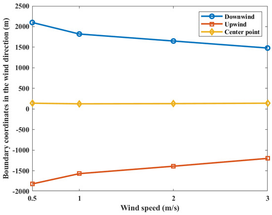 The contour coordinates with a casualty probability of 0.9 at various wind speeds are shown in Figure 8. When the wind speed is 0.5 m/s, the area of casualty probability is at −1820 m upstream and 2100 m downstream distances of the leak point. When the wind speed is 1.0 m/s, the area is at −1570 m upstream and 1820 m downstream distances of the leak point. When the wind speed is 2.0 m/s, the area is at −1390 m upstream and 1650 m downstream distances of the leak point. When the wind speed is 3.0 m/s, the area is at −1200 m upstream and 1480 m downstream distances of the leak point, respectively. It can be seen that both the upper and lower boundaries of the probability contour decrease with increasing wind speed, while the coordinates of the center point of the probability contour do not change significantly. This is due to the fact that the gas cloud mixing speed with air increases with the increase in wind speed during the overall movement of the gas cloud downstream. However, at the same time, the mass and volume of the gas cloud are decreasing. Under the combined effects of the factors in above, there is no obvious change in the location of the explosion center point. Therefore, the increase in wind speed will only reduce the casualty probability at the target point.