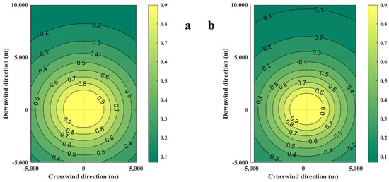 Diffusion diagrams of casualty probabilities obtained from the SLAB-TNO model at various LFLs. (a) LFL is 0.0189 kg/m3, (b) LFL is 0.0756 kg/m3.