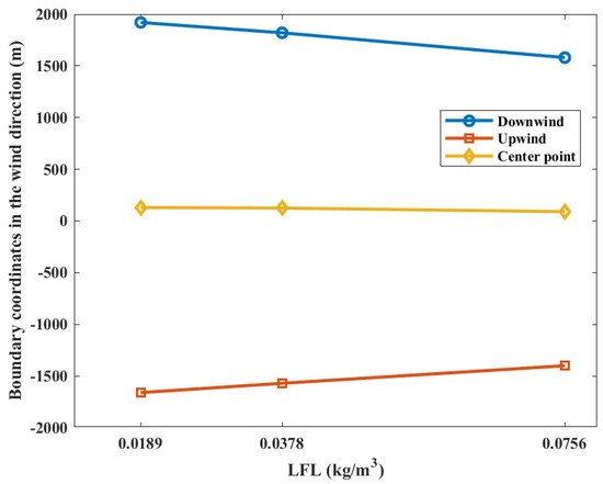 The contour coordinates with a casualty probability of 0.9 at various LFLs is shown in Figure 11. While the LFL is 0.0189 kg/m3, the area of casualty probability is at −1660 m upstream and 1920 m downstream distances of the leak point. When the LFL is 0.0378 kg/m3, the area is at −1570 m upstream and 1820 m downstream distances of the leak point. When the LFL is 0.0756, the area is at −1400 m upstream and 1580 m downstream distances of the leak point, respectively. It can be seen that the upper and lower boundaries of the probability contour decrease with the increase in the LFL, while the coordinates of the explosion center point do not change significantly. This can be explained by the fact that the gas cloud concentration diffusion is not affected by the LFL during the gas cloud diffusion process. The upstream contour line of the combustible gas cloud is located on the windward side, and the downstream contour line of the combustible gas cloud is located on the leeward side. Therefore, the upstream combustible gas cloud is more “flattened” by the ambient wind. This phenomenon can be observed in Figure 2. Therefore, the closer to the downstream, the “looser” the combustible gas cloud concentration contours are, which indicates a larger concentration gradient downstream of the gas cloud. Increasing the LFL has a more significant effect on the downstream position of the gas cloud, and therefore, the center point of the explosion is shifted upstream.