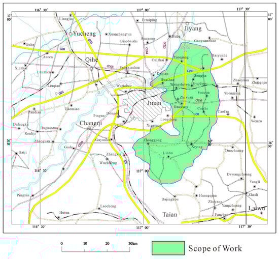 Licheng District, Jinan City, is located in the transitional zone between the western uplift and the northwestern depression of Shandong in terms of tectonics, characterized by a north-dipping monocline structure dominated by Paleozoic strata. Igneous rocks are mainly distributed in the northern part of Jinan City, also known as the “Jinan rock mass”, with the main evaluation area located in the western Shandong block.