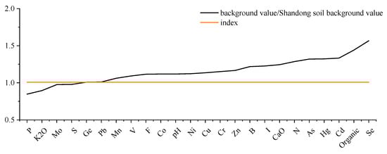 When comparing the Licheng District soil background values to those of Shandong Province, the background value ratio K values of elements range from 0.85 to 1.57. Elements with lower values (0.8 < K ≤ 0.9) include P and K2O, which are lower than the provincial background values and should be given attention in agricultural production. Elements with values close to one (0.9 < K < 1.1) include S, Mo, Ge, Pb, Mn, and V. Elements with higher values (1.1 < K ≤ 1.2) include pH, Co, F, Ni, Cu, Cr, and Zn. Elements with significantly higher values (K > 1.2) include B, I, CaO, N, As, Hg, Cd, organic matter, and Se, with Se being particularly prominent, significantly higher than the soil Se element background values in Shandong Province.