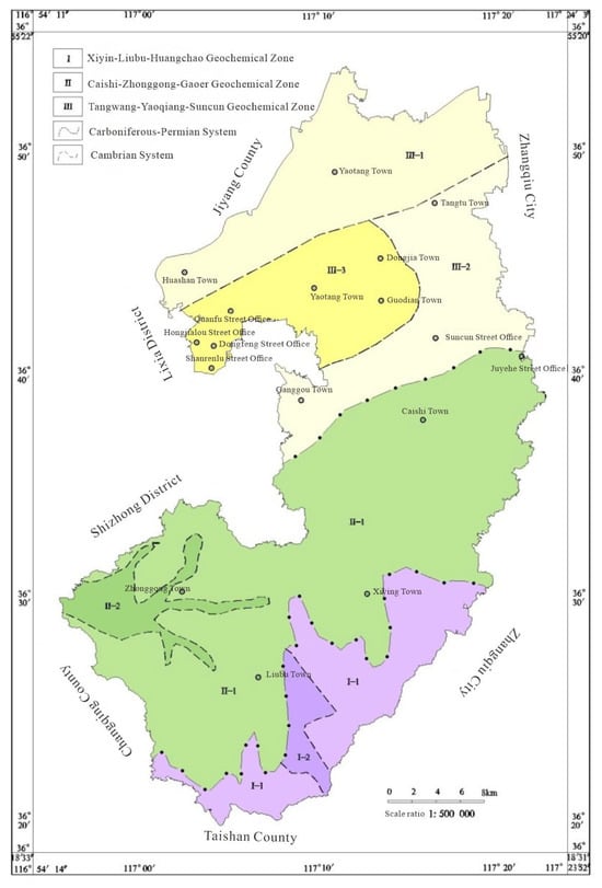 Based on variations in geological background and elemental compositions, this area is divided into two geochemical subregions: the Xiying–Huangchao Geochemical Subregion (I-1) and the Liubu Geochemical Subregion (I-2). The characteristics of each subregion are as follows: