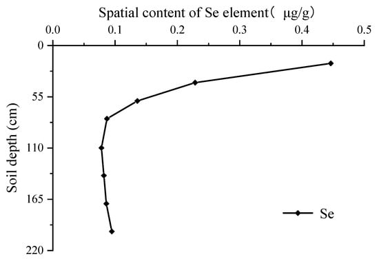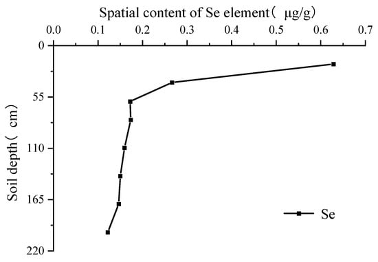From the vertical profiles of CP1 and CP2 (Figure 8 and Figure 9), the Se element showed a trend of decreasing content from top to bottom, with a stable layer from 60 to 200 cm, indicating that these elements are mainly enriched in the surface layer of the soil, possibly influenced by external sources rather than soil parent material.